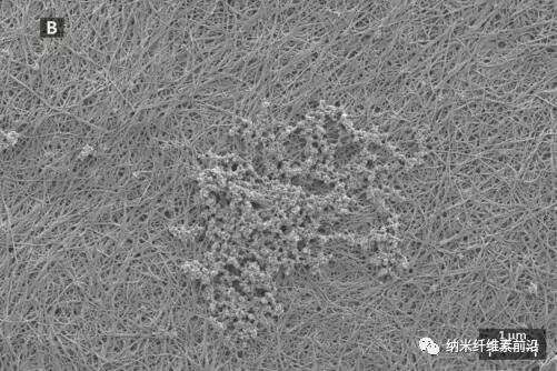 A图为刚毛藻纤维素制成了纳米纤维素滤膜的SEM图像,B图为过滤牛血清白蛋白(BSA)后的SEM图像。